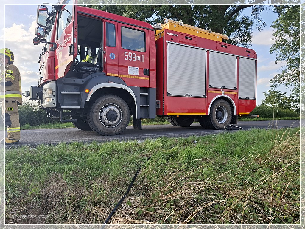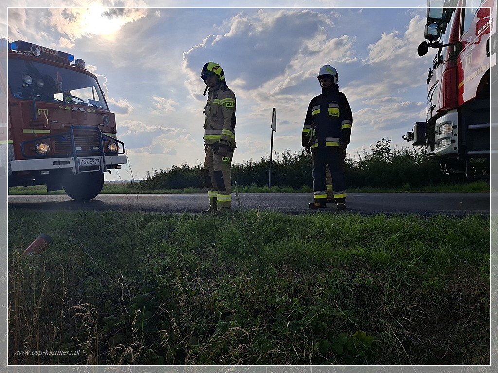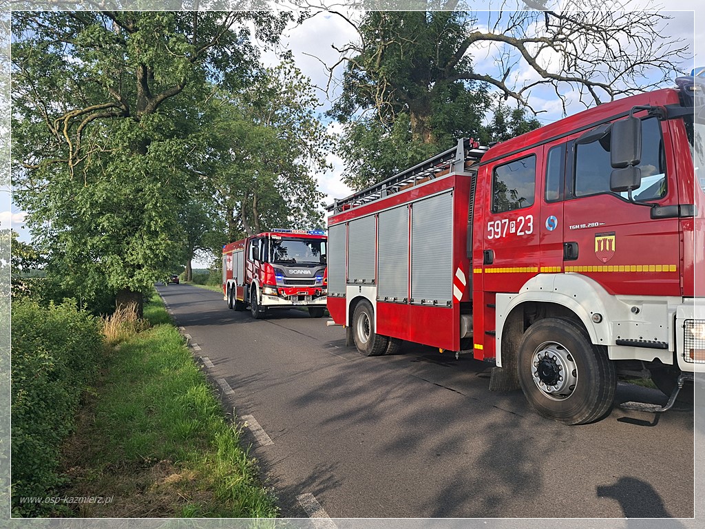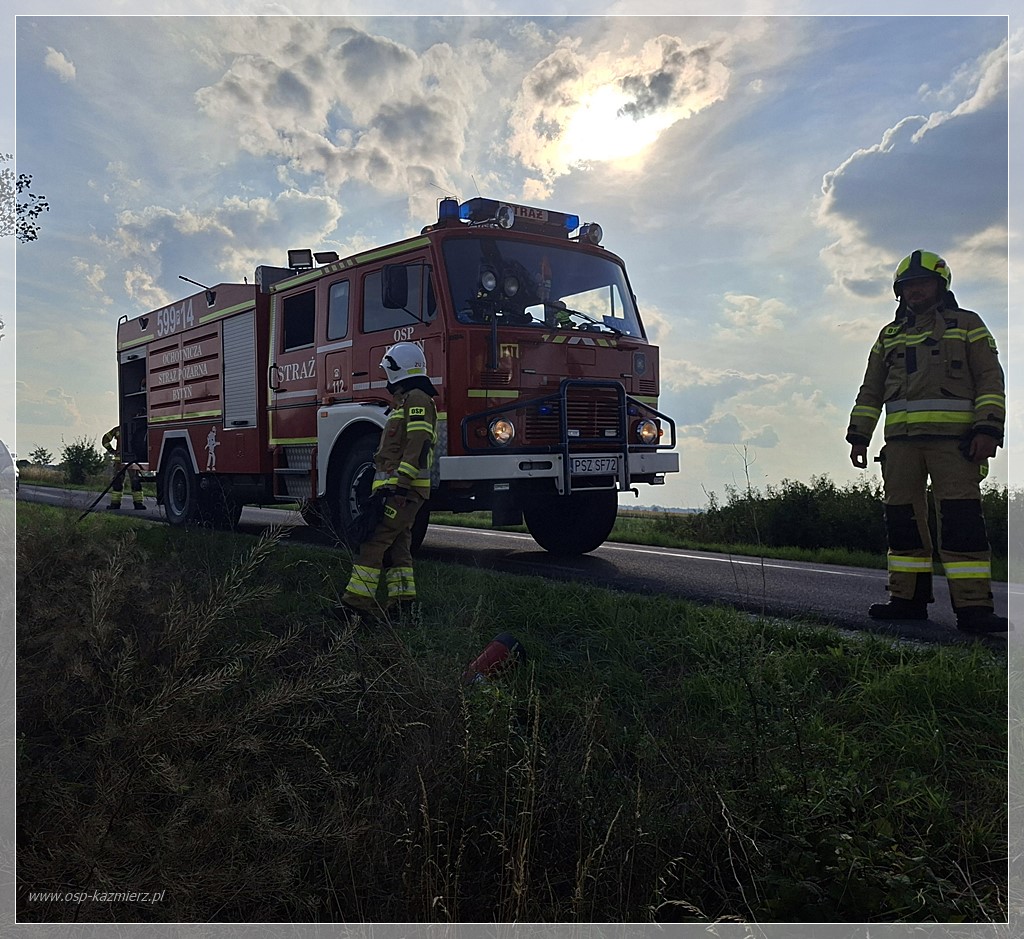 Po południu, w niedzielę 20 lipca 2025 r. doszło do pożaru kombajnu zbożowego pracującego na polu między Kaźmierzem i Młodaskiem podczas koszenia rzepaku. Dzięki szybkiej reakcji świadków-pracowników i sprawnemu działaniu straży pożarnej ogień udało się opanować, minimalizując straty. Na miejsce natychmiast zadysponowano Jednostkę Ratowniczo-Gaśniczą z Szamotuł oraz zastępy Ochotniczych Straży Pożarnych z Bytynia, Chlewisk i Kaźmierza. Działania polegały na ugaszeniu maszyny oraz zabezpieczeniu pola przed rozprzestrzenieniem się pożaru na okoliczne uprawy.