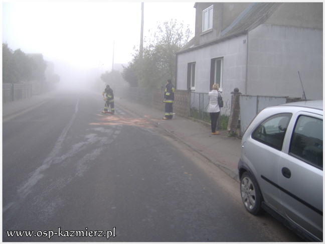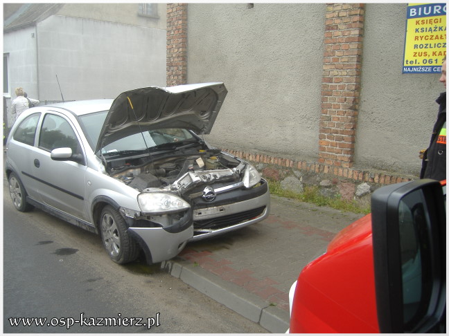 W sobotni poranek 8 maja 2010 r. około godziny 6.50 druhowie z naszej jednostki otrzymali zgłoszenie o kolizji na ul. Szamotulskiej w Kaźmierzu. Po dotarciu na miejsce okazało się, że kierująca autem marki Opel Corsa uderzyła w betonowy słupek ogrodzenia. Na miejsce zdarzenia poza jednostką OSP Kaźmierz dotarła również policja i pogotowie, które zabrało kobietę do szpitala w celu przebadania.