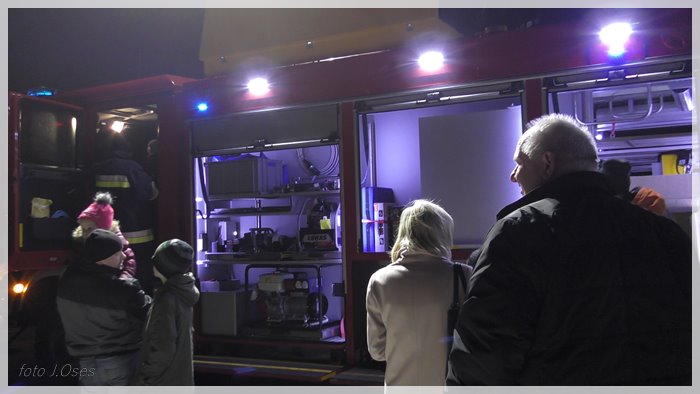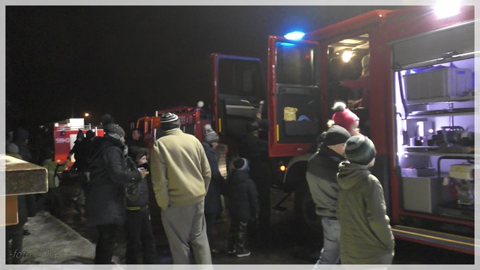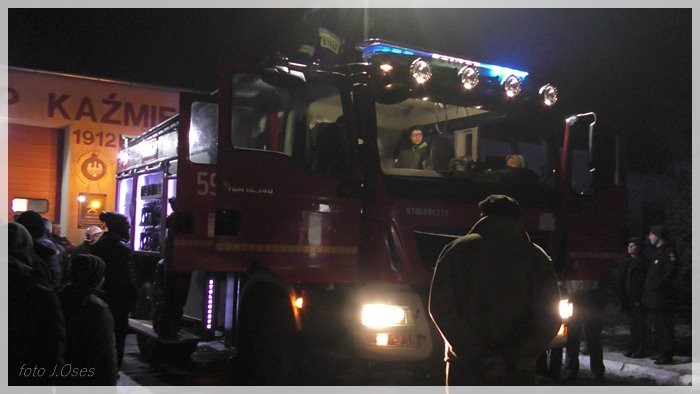 Druhowie strażacy po auto pojechali już w czwartek aż do Kielc. W piątek pozostali strażacy z niecierpliwością oczekiwali na przyjazd kolegów. Kilka minut po godz. 19.00 auto dotarło do Kaźmierza. Na ul. Poznańskiej czekały już na nie pozostałe auta z jednostki OSP, które towarzyszyły nowemu pojazdowi w drodze do remizy. Po drodze kolumna wozów strażackich zatrzymała się przy miejscowym cmentarzu, a druhowie strażacy udali się do grobu zmarłego w roku 2015 prezesa kaźmierskiej OSP śp. Andrzeja Nowackiego w celu złożenia zapalonych zniczy. Ten symboliczny gest miał na celu oddanie hołdu byłemu prezesowi, który kilka lat temu zapoczątkował starania o zakup nowego auta dla kaźmierskiej jednostki. Następnie kolumna aut ruszyła pod remizę, przejeżdżając przez szpaler utworzony przez strażaków z racami. Nie zabrakło także fajerwerków. Na miejscu przed remizą na nowe auto czekali również; Przewodnicząca Rady Gminy Kaźmierz, Arleta Wojciechowska i wójt gminy Kaźmierz, Zenon Gałka. Przed remizą zebrała się spora grupa mieszkańców Kaźmierza, którzy z bliska chcieli obejrzeć nowy sprzęt kaźmierskich strażaków. Piękne auto będzie służyć strażakom z pewnością przez wiele lat, a o tym jak wielkim szacunkiem kolegów cieszył się dh Andrzej Nowacki, świadczy fakt, że pojazd (ochrzczono) imieniem JĘDRUCH (w taki sposób zwracano się do śp. Andrzeja) a tabliczkę z nazwą umieszczono za przednią szybą.
