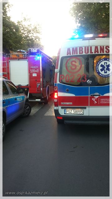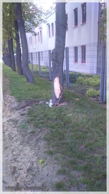 W sobotę 13 maja 2017 r., Dyżurny Stanowiska Kierowania PSP w Szamotułach zadysponował JRG Szamotuły i OSP Kaźmierz do zdarzenia, które miało miejsce w Kaźmierzu na ul. Okrężnej. Kierujący samochodem osobowym z przyczyn ustalanych przez Policję, uderzył w przydrożne drzewo. Poszkodowana została jedna z osób podróżujących pojazdem.