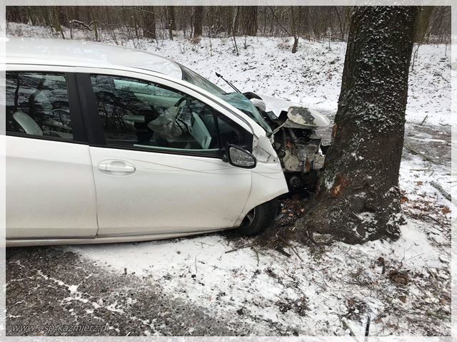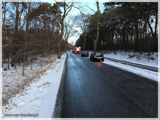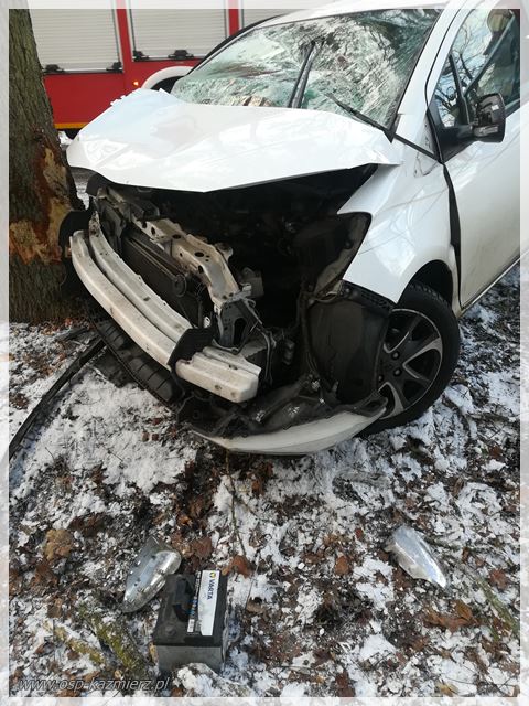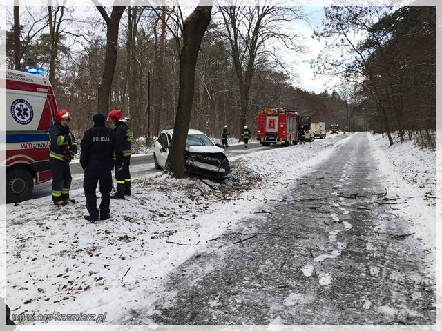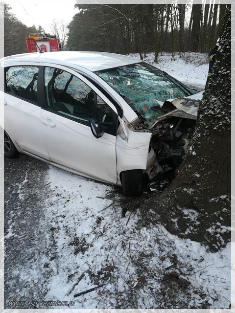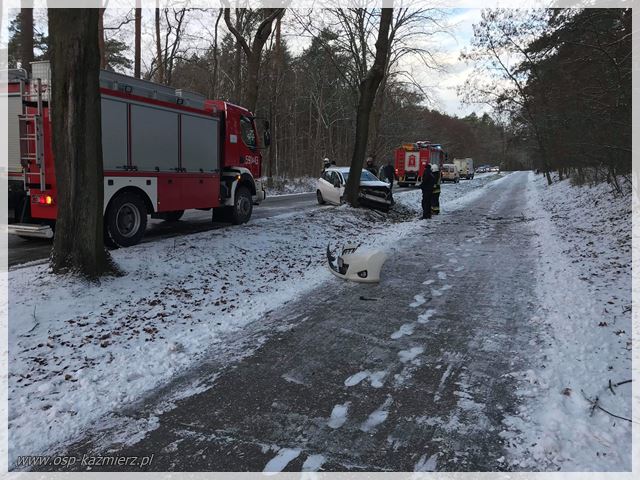 Dnia 3 stycznia 2019 r. około godziny 10.00 strażacy udali się do wypadku drogowego w Kaźmierzu. Auto osobowe uderzyło w przydrożne drzewo. Osoba poszkodowana została zabrana do szpitala. Na miejsce dyżurny Stanowiska Kierowania PSP w Szamotułach zadysponował: JRG Szamotuły, OSP Kaźmierz. Na terenie zdarzenia działały również ZRM i Policja.