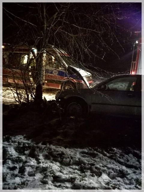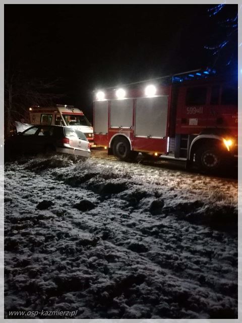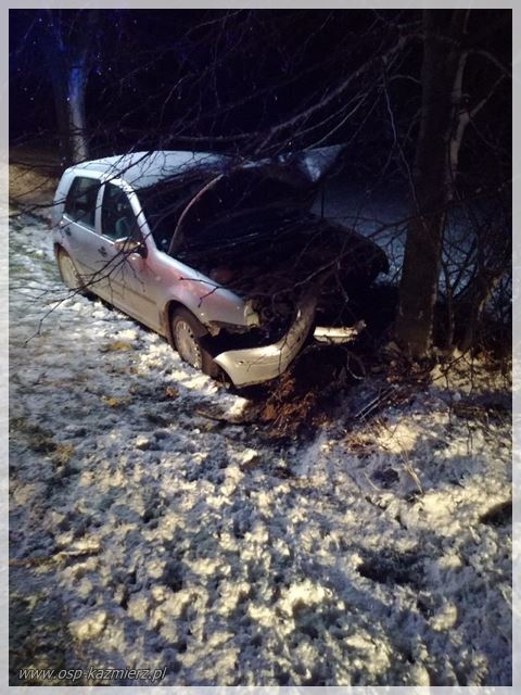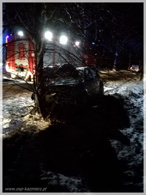 W piątek 18 stycznia 2019 r. około godziny 17.20 strażacy udali się na drogę Kaźmierz-Brzezno, gdzie auto osobowe uderzyło w drzewo. Po dojeździe na miejsce zastano kierującego, który znajdował się na zewnątrz pojazdu. Udział w akcji brały: JRG Szamotuły, OSP Kaźmierz, ZRM, Policja.
