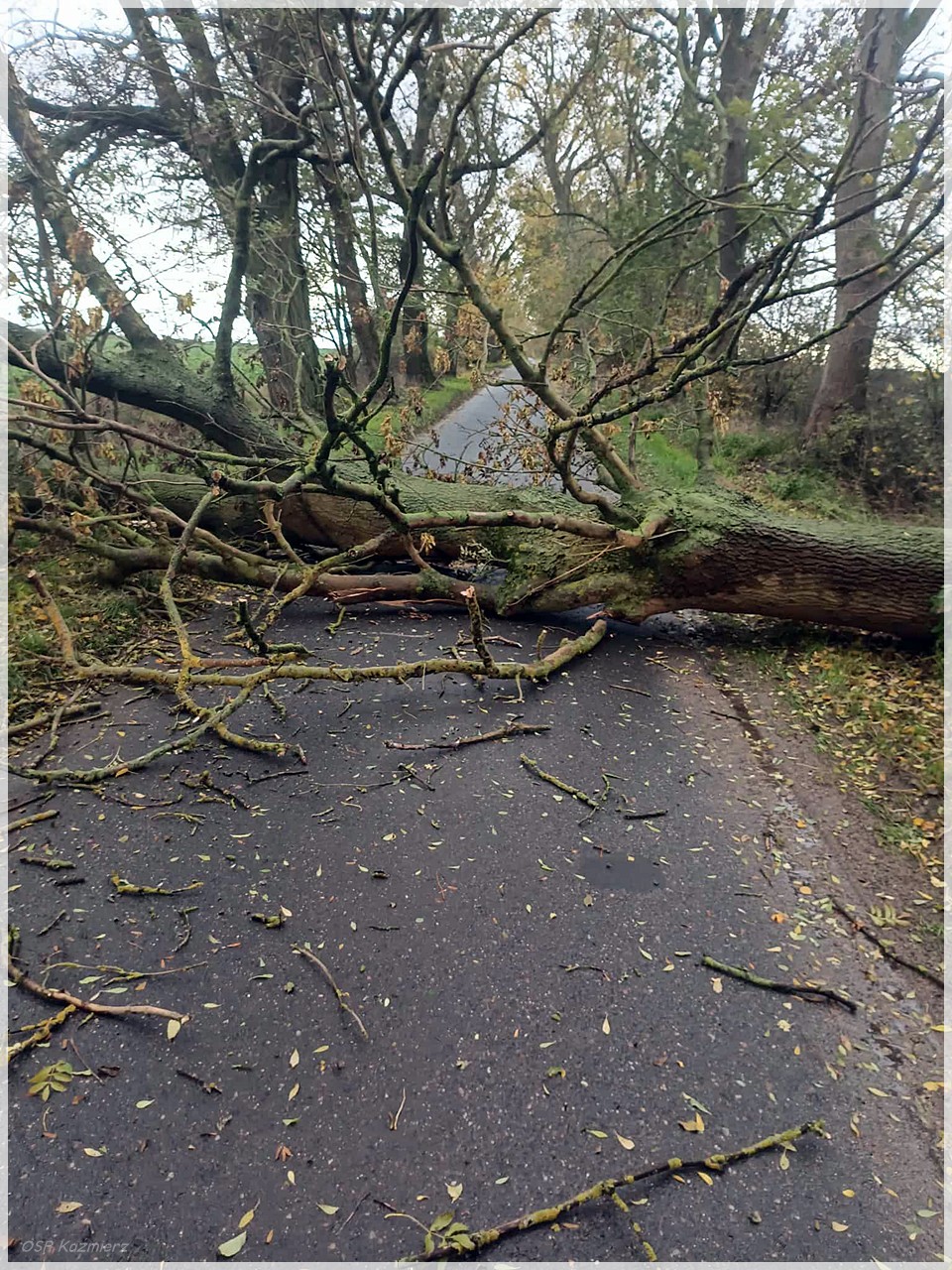 W czwartek 30 października 2025 r., strażacy z Ochotniczej Straży Pożarnej w Kaźmierzu mieli pracowity dzień. Po przejściu silnych opadów deszczu i porywistych podmuchów wiatru, druhny i druhowie zostali wielokrotnie zadysponowani do interwencji związanych ze szkodami pogodowymi. Głównym zadaniem było usuwanie powalonych drzew i połamanych konarów, które tarasowały drogi na terenie gminy, uniemożliwiając bezpieczny przejazd. Strażacy apelują o zachowanie szczególnej ostrożności podczas niekorzystnych warunków atmosferycznych.