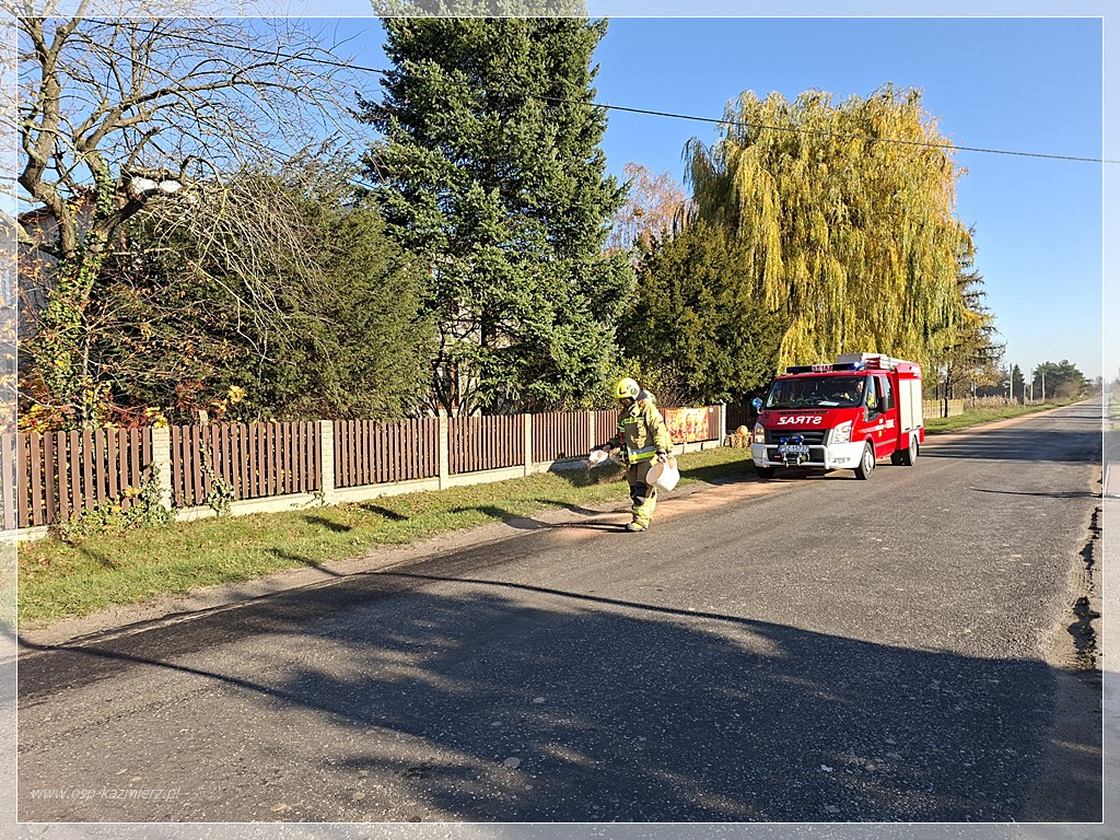 W sobotę 8 listopada 2025 r., strażacy z Ochotniczej Straży Pożarnej w Chlewiskach i Kaźmierzu zostali zadysponowani do zdarzenia. Interwencja dotyczyła neutralizacji rozległej plamy substancji ropopochodnej na jezdni. Plama ciągnęła się na długości około 2 kilometrów wzdłuż ulicy Czereśniowej. Dzięki skoordynowanej akcji obu jednostek zagrożenie zostało skutecznie usunięte. Przywrócono bezpieczeństwo na tym odcinku drogi.