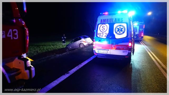 Dnia 3 stycznia 2019 r. około godziny 10.00 strażacy udali się do wypadku drogowego w Kaźmierzu. Auto osobowe uderzyło w przydrożne drzewo. Osoba poszkodowana została zabrana do szpitala. Na miejsce dyżurny Stanowiska Kierowania PSP w Szamotułach zadysponował: JRG Szamotuły, OSP Kaźmierz. Na terenie zdarzenia działały również ZRM i Policja.