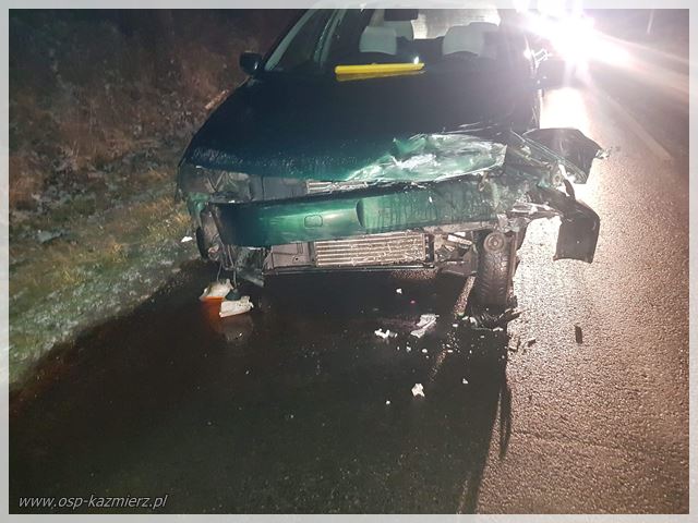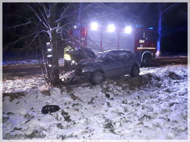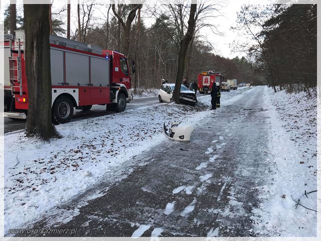 W piątek 18 stycznia 2019 r. około godziny 17.20 strażacy udali się na drogę Kaźmierz-Brzezno, gdzie auto osobowe uderzyło w drzewo. Po dojeździe na miejsce zastano kierującego, który znajdował się na zewnątrz pojazdu. Udział w akcji brały: JRG Szamotuły, OSP Kaźmierz, ZRM, Policja.