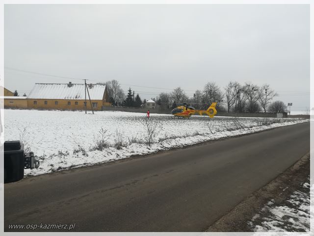 W środę 23 stycznia 2019 r. strażaków z Kaźmierza trzykrotnie dysponowano do zdarzeń. Pierwsze w godzinach porannych, to pożar gałęzi na polu w miejscowości Chlewiska, kolejne około godziny 13:16, to zabezpieczenia lądowania Lotniczego Pogotowia Ratunkowego w miejscowości Brzezno wraz ze strażakami z JRG Szamotuły. Następnie o godz. 14:35 strażacy udali się do miejscowości Młodasko, gdzie na kominie budynku mieszkalnego dość długo przesiadywał kot, który nie potrafił sam zejść.