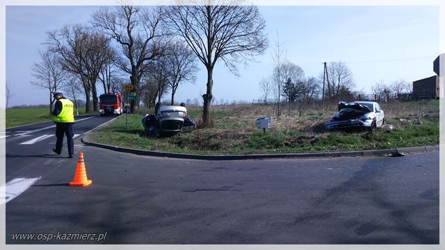 W sobotę 1 kwietnia 2017 r. po godz. 9 rano doszło do zderzenia dwóch aut osobowych w miejscowości Pólko (gm. Kaźmierz), w wyniku którego pięć osób trafiło do szpitala. Jedno z aut po zderzeniu przewróciło się i znajdowało się w pobliskim rowie. Osoby biorące udział w zdarzeniu opuściły pojazdy o własnych siłach. Na miejsce akcji zadysponowano: JRG Szamotuły, OSP Kaźmierz, OSP Otorowo, OSP Podrzewie, ZRM, Policję. Strażacy zabezpieczyli miejsce zdarzenia, udzielili pomocy poszkodowanym, odłączyli akumulatory w pojazdach, zneutralizowali płyny eksploatacyjne, kierowali ruchem ,posprzątali miejsce akcji.